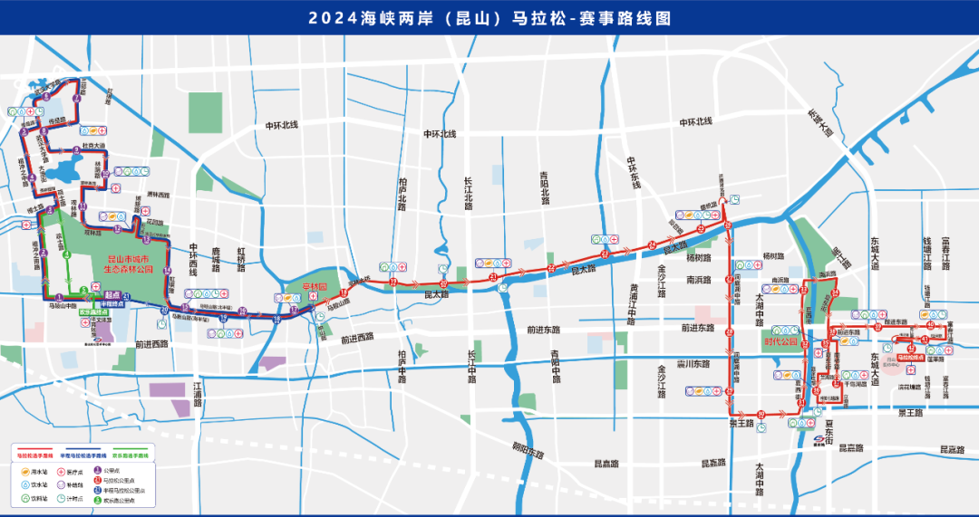 (一)马拉松路线:西部体育中心起点(马鞍山路体育馆路口东侧)→马鞍山中路→祖冲之南路→博士路→院士路→萧林西路→祖冲之中路→传是路→武汉大学路→三邻路→传是路→武汉大学路→杜克大道→林荫路→萧林西路→观林路→博雅路→花园路→斜泾路→庙泾河中央水廊→虹祺路→马鞍山路(北半幅)→昆太路→洞庭湖路西侧辅道→洞庭湖盛帆路路口→洞庭湖中路→景王路→夏西街→南浜路→夏东街→兰湖路→盛家庄路→柳叶湖路→立塘路→千岛湖路→南桥路→夏东街→前进东路→富春江路→栈泾路→栈泾路折返→怒江路→东部奥体中心终点(怒江路蓬莱路口北侧),全长42.195公里。
