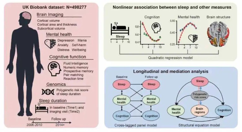 研究者从UK Biobank收集到50万人的基因、影像以及行为数据,从多维度展开了研究,确定了睡眠与遗传和认知因素、大脑结构以及心理健康之间存在非线性的关系,而7小时睡眠为最佳时长,能够促进中老年群体的身心健康。