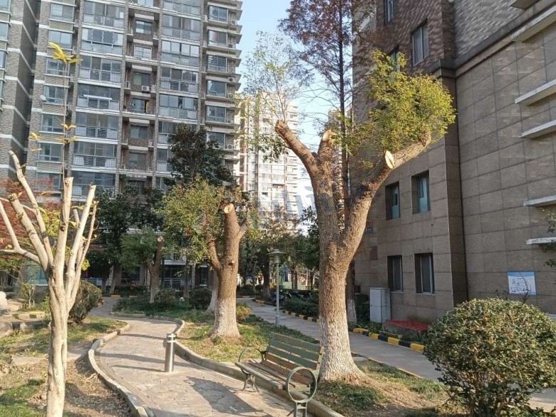 但是远离居民楼的小池塘边和小广场绿地附近的多棵树木却被直接砍头。这些树木位置远离居民楼不会遮挡光线,但却惨遭砍头!另外两楼之间东西方向的水杉树直接拦腰砍伐。