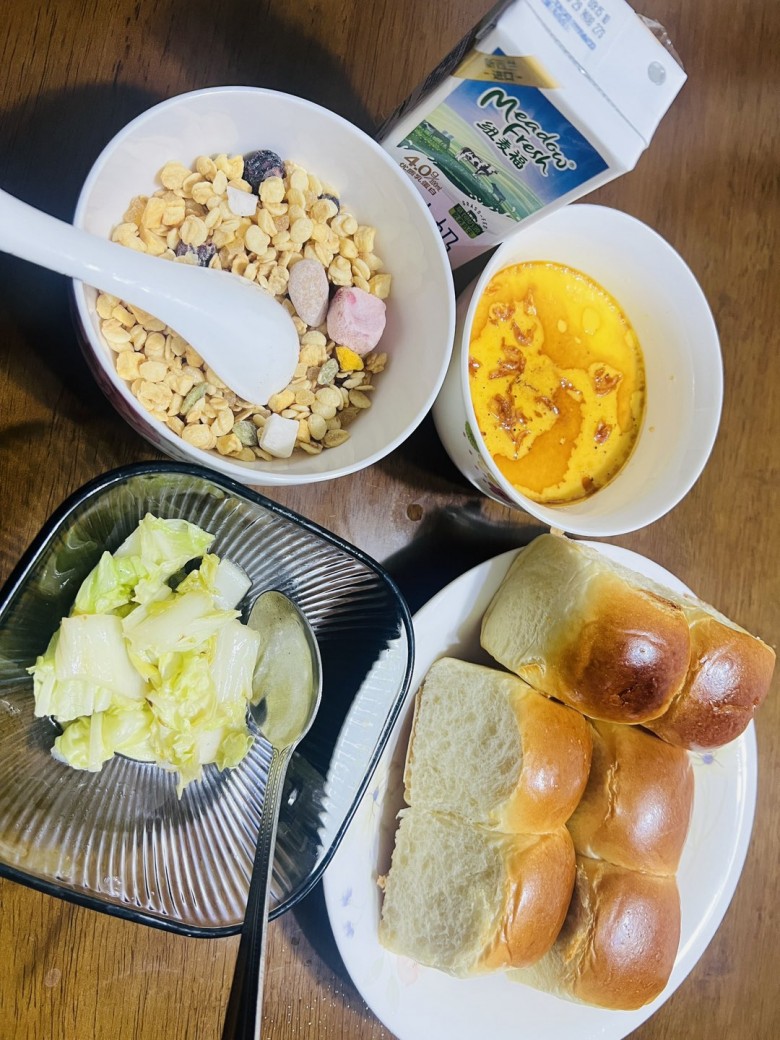 风筝遇上风:今天的早餐:牛奶+麦片+两口大白菜+鸡蛋羹+手撕面包,每天晚上都要想早上给娃煮什么[表情][图片] (2024-12-19 11:11)