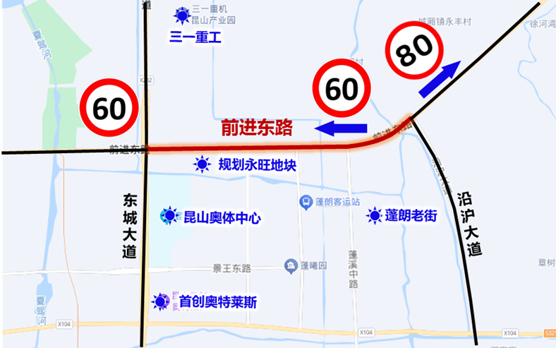 本次调整范围为前进东路西起东城大道东至沿沪大道段,全长3.6km,该道路属联系昆太协同发展的重要交通走廊,也是昆山开发区内部区域重要性的骨架交通干道,沿线交通流量大,客货交通构成复杂。根据《昆山市城市总体规划(2017-2035年)》,昆山开发区城镇开发边界目前已由东城大道向东延展至沿沪大道,该道路周边已入驻昆山奥体中心、永旺梦乐城(开发中)、蓬朗老街等大型公建、综合体、居住小区等,沿线交通存在流量大等特点。为保障道路交通安全,提升交通管理水平,现结合《城镇化地区公路工程技术标准(JTG 2112-2021)》等法规、规范,经多部门参与并聘请相关专家充分论证,拟对前进东路(东城大道至沿沪大道段)管理限速进行调整,时速由当前80km/h调整为60km/h。