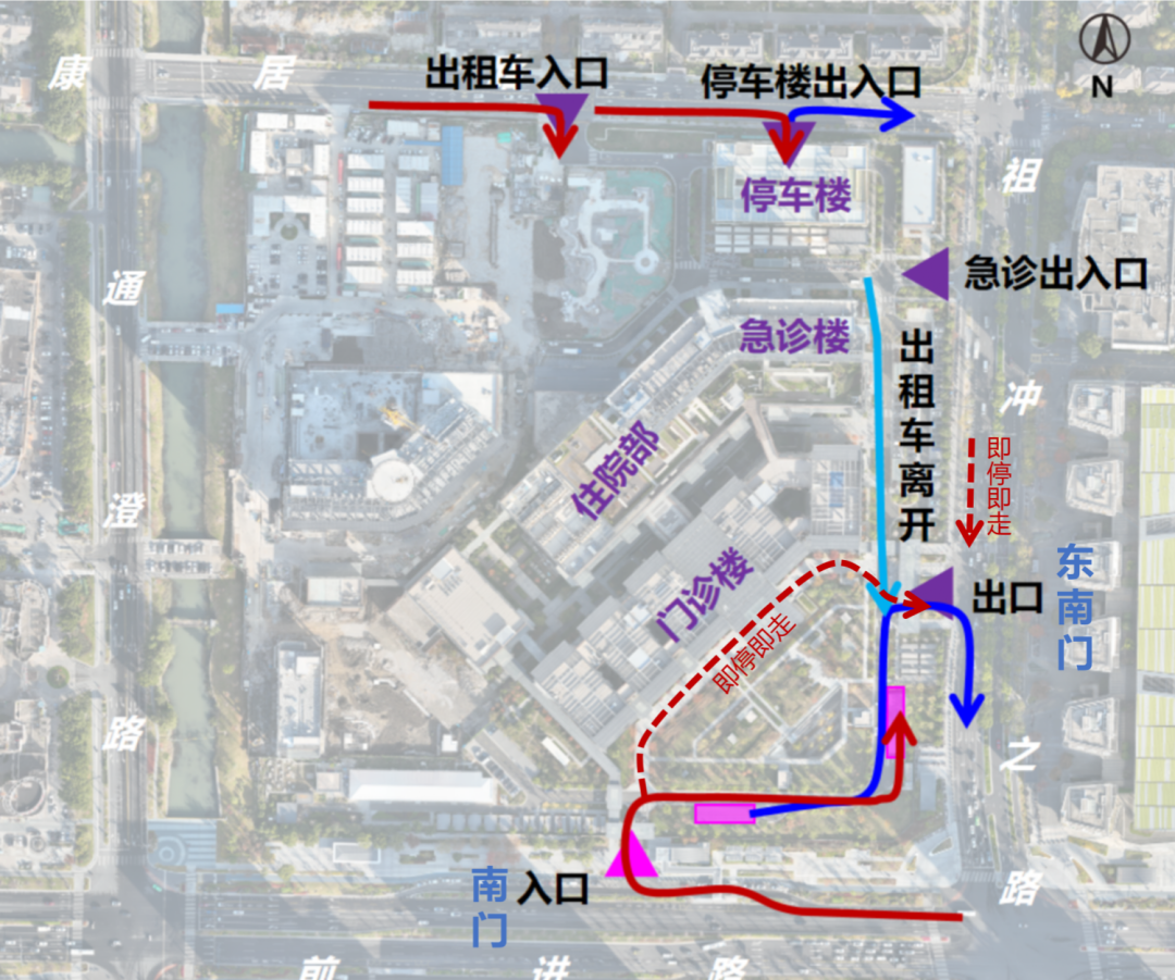 早高峰时段,南门(前进路)作为私家车辆入口。车辆请按照路面管理人员引导,靠内侧就医通道有序排队进入院区。院内门诊楼前增加即停即走车位,严禁车辆长时间占道停放。
