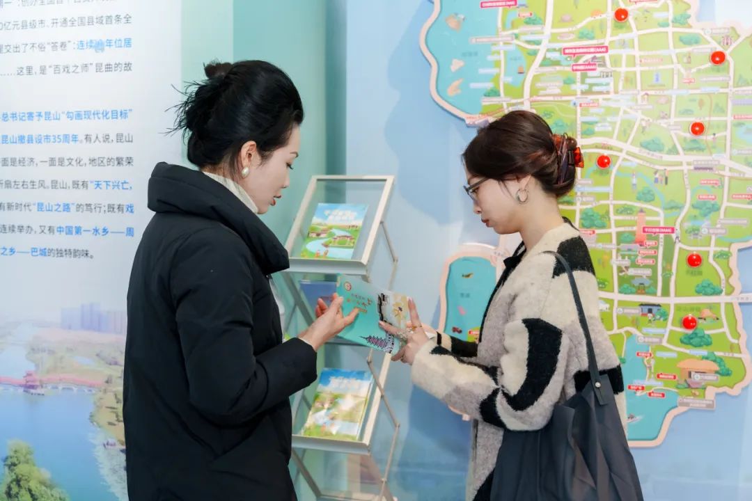 旅客赵女士正在昆山市全域旅游导览图前驻足,寻找着千灯的位置。千灯地处昆山南部,东依上海青浦,距上海虹桥机场30公里。徐女士手指轻轻一点千灯旁的红色按钮,便在一旁的屏幕上“遇见”千灯的古建、风光、美食……互动感十足。