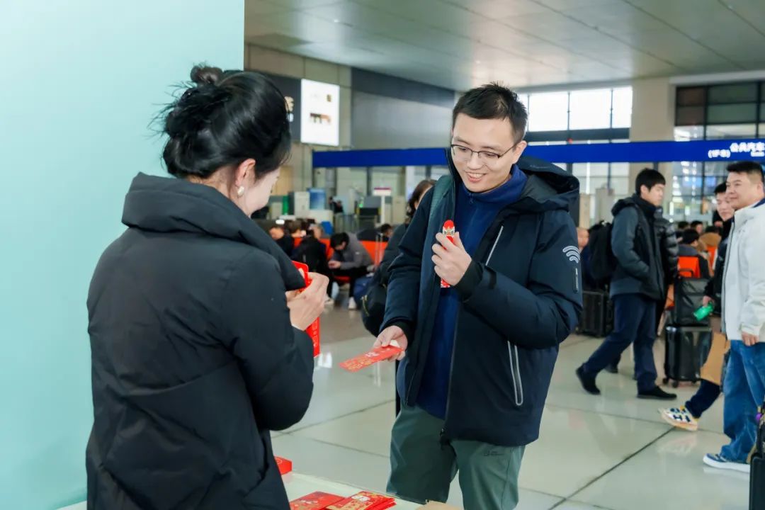 新年将至,活动现场还特别准备了抽取新年签的活动。“我抽中了‘有钱有闲’!”在充满仪式感的活动中,现场的氛围欢快热烈。工作人员还为旅客送上红包袋,为旅途增添一份年味。