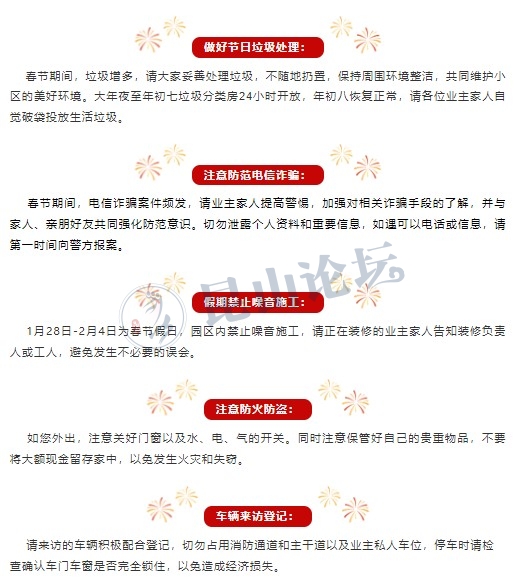 为确保业主家人度过一个“安全、文明、祥和、平安”的春节,请业主家人配合做好自家的防范措施,携手共创平安家园,在此温馨提示各位业主家人关注以下事项:
