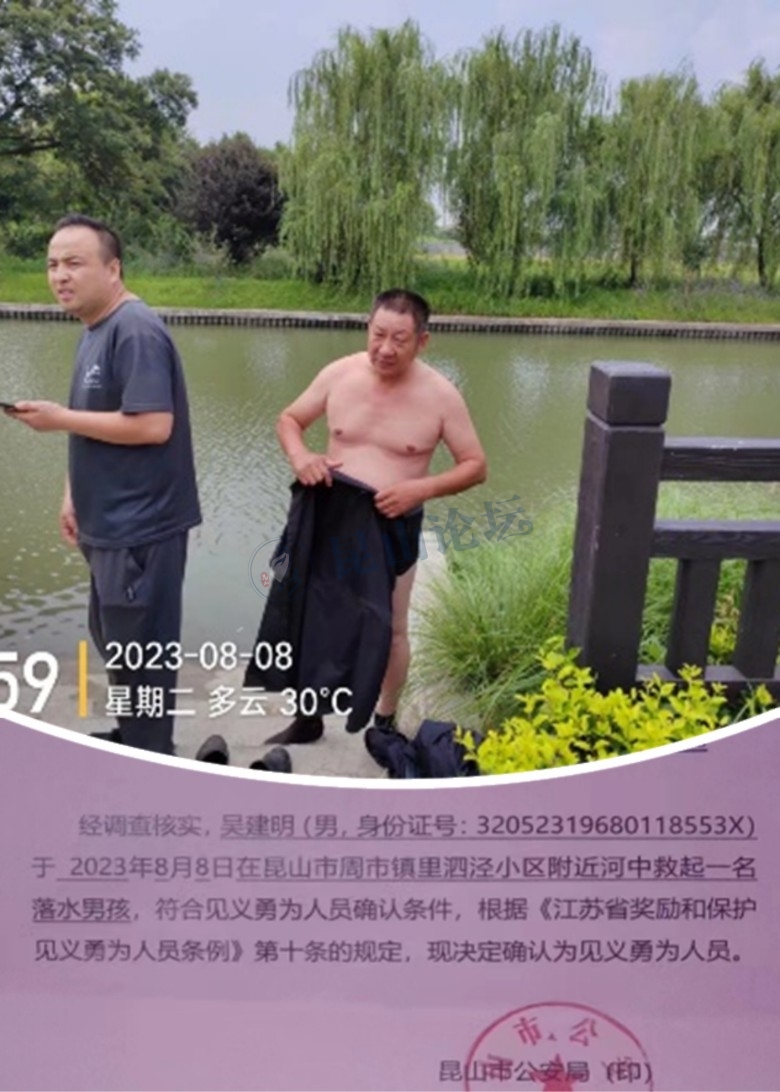 2023年8月,里泗泾物业工作人员巡逻时听到有人呼救,发现有小孩落水,于是他三下五除二立即脱去外衣,就奋不顾身跳进河道内救起一名落水儿童,受到周市镇派出所见义勇为奖。