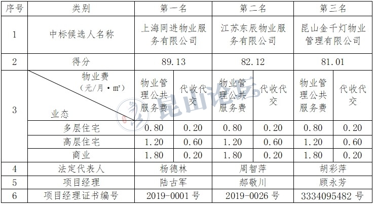 公示期:自开标结果公示之日起七天。对开标结果没有异议的,招标人将组织召开业主大会,确定最终中标人。如有异议可向昆山市千灯镇社会治理办公室反映,联系电话:36881410。