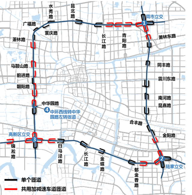 昆山中环快速路系统由东线黄浦江路、南线G312、西线江浦路、北线S339构成,全长约44.2公里。全线采用高架和地面辅道形式,双向六车道,共有全互通立交3座,半互通立交1座(中华园路)和上下匝道58个。近年来,中环南线长江路、郁金香路,中环西线广福路、萧林路等匝道拥堵异常严重。