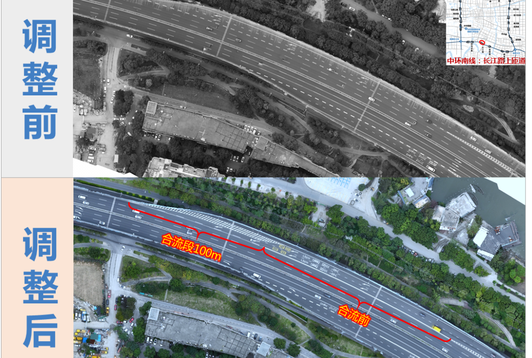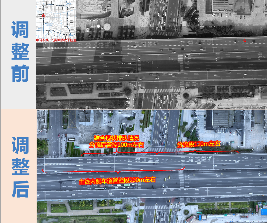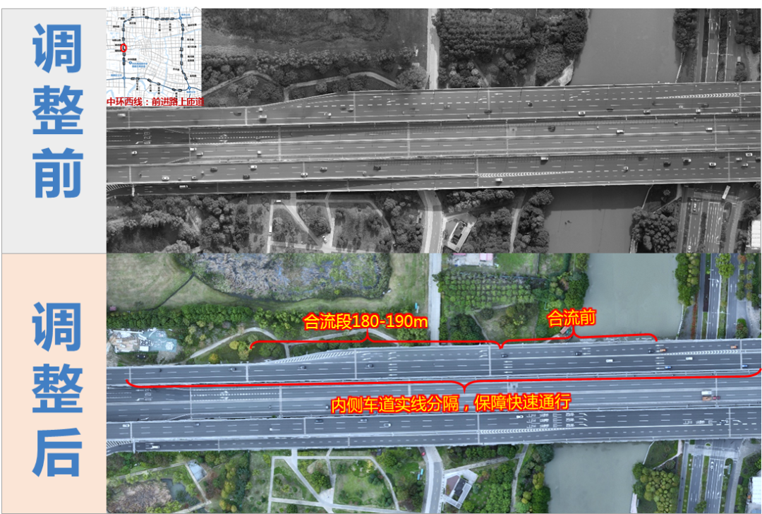 上匝道分合流前和合流段两个阶段。针对运行良好的匝道区域,采用虚实线分隔、交替通行、导流岛设置等措施引导匝道车流先合并后再汇入主线;在中环西线-前进路上匝道等拥堵节点,优先保障主线内侧车道快速通行,主线外侧车道和匝道结合车辆实际排队情况引导管控。