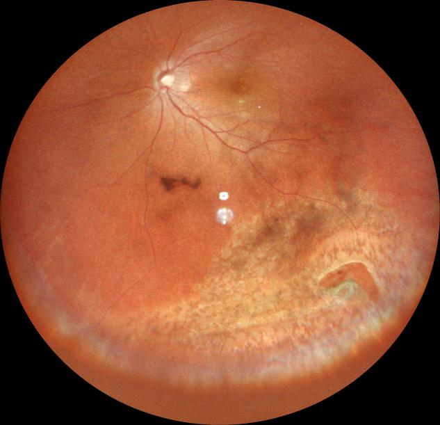 ▲FCB植入术后网膜复位、并行眼底激光封闭裂孔