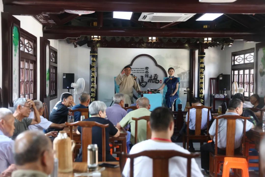 千灯镇歇马桥村老茶馆,是一个充满历史韵味和水乡风情的基层文化空间,典雅的内饰、木制的桌椅,唤起大家的儿时回忆。老茶馆所在的歇马桥村是中国传统村落,不仅保留了古石板路、明清建筑等传统元素,还融入了现代设计,新建了牌楼、韩世忠纪念馆等地标性建筑,让这个古村落散发出浓浓的历史韵味和水乡风情。如今的老茶馆已成为村民议事、游客体验乡村慢生活的场所,成为歇马桥村文化振兴和产业融合的新亮点。