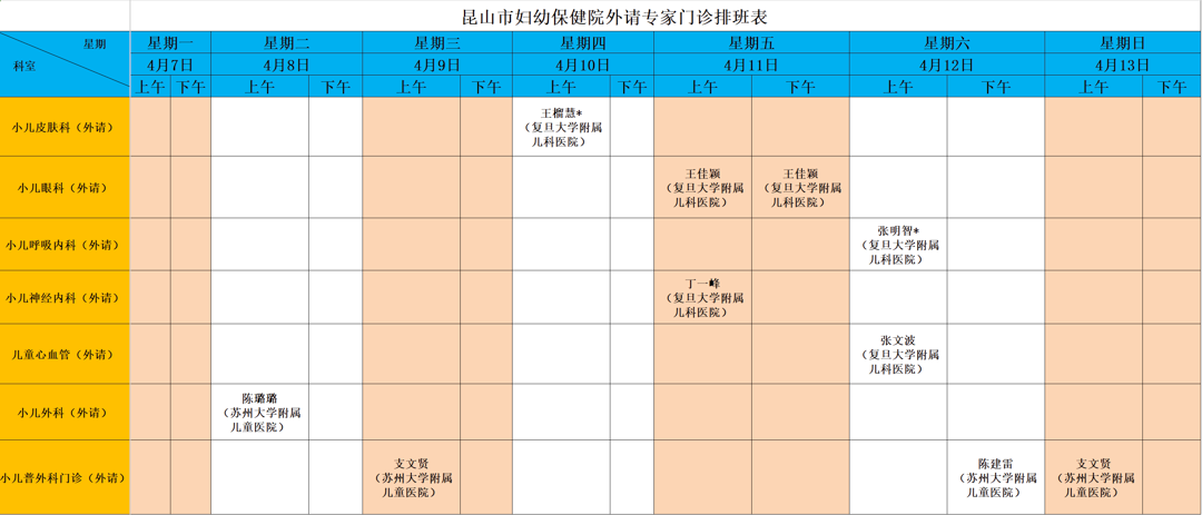 2025年4月7日~2025年4月13日,上海复旦附属儿科医院和苏州大学附属儿科医院多名专家将至昆山市妇幼保健院坐诊。