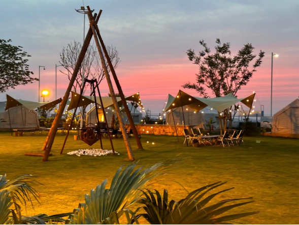 骑行穿梭于潋滟湖光之间,飞盘划破天际的欢笑声与户外KTV的旋律交织,暮色渐沉时围坐在帐篷边品味醇香咖啡,看落日一点点浸入粼粼湖面,篝火闪耀,吃着烧烤享受湖畔露营的惬意时光。