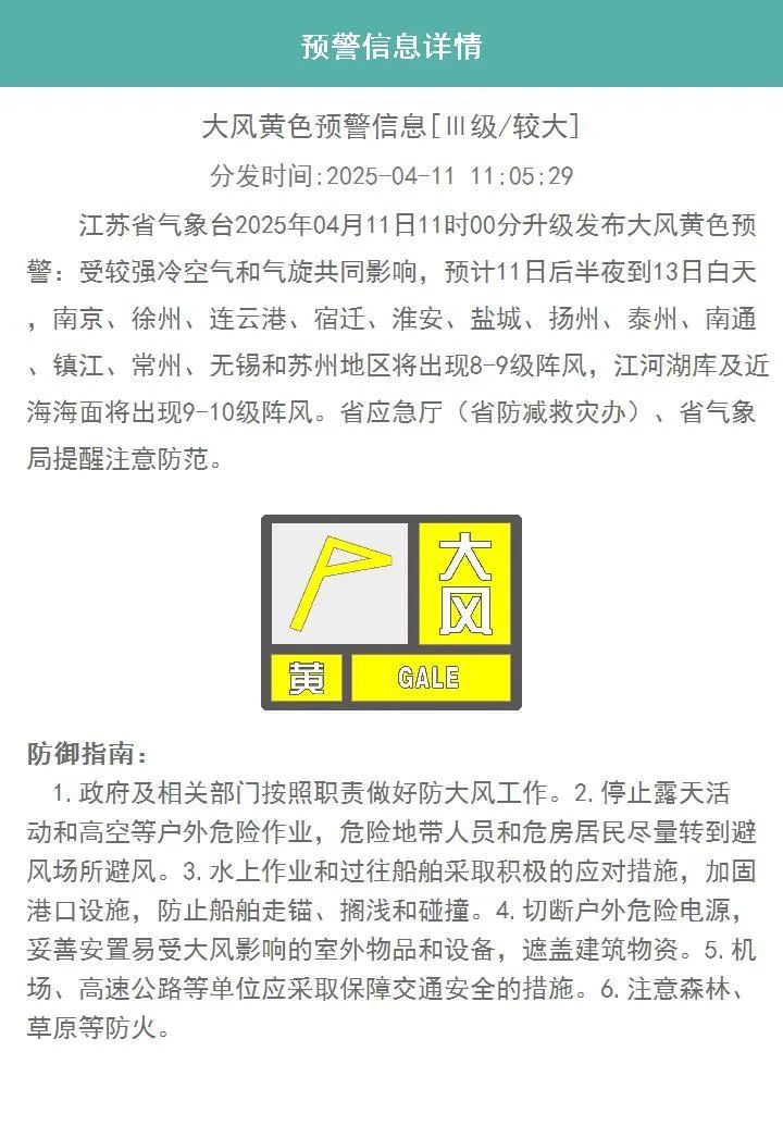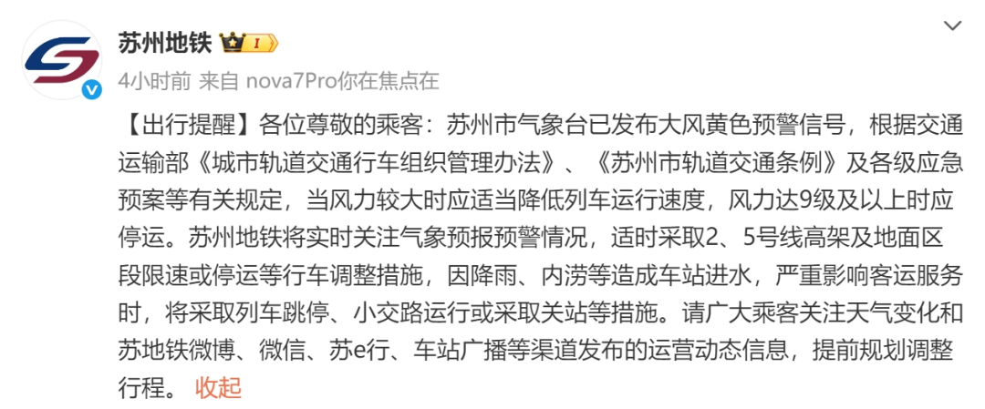 苏州市气象台已发布大风黄色预警信号,根据交通运输部《城市轨道交通行车组织管理办法》《苏州市轨道交通条例》及各级应急预案等有关规定,当风力较大时应适当降低列车运行速度,风力达9级及以上时应停运。苏州地铁将实时关注气象预报预警情况,适时采取2、5号线高架及地面区段限速或停运等行车调整措施,因降雨、内涝等造成车站进水,严重影响客运服务时,将采取列车跳停、小交路运行或采取关站等措施。请广大乘客关注天气变化和苏地铁微博、微信、苏e行、车站广播等渠道发布的运营动态信息,提前规划调整行程。