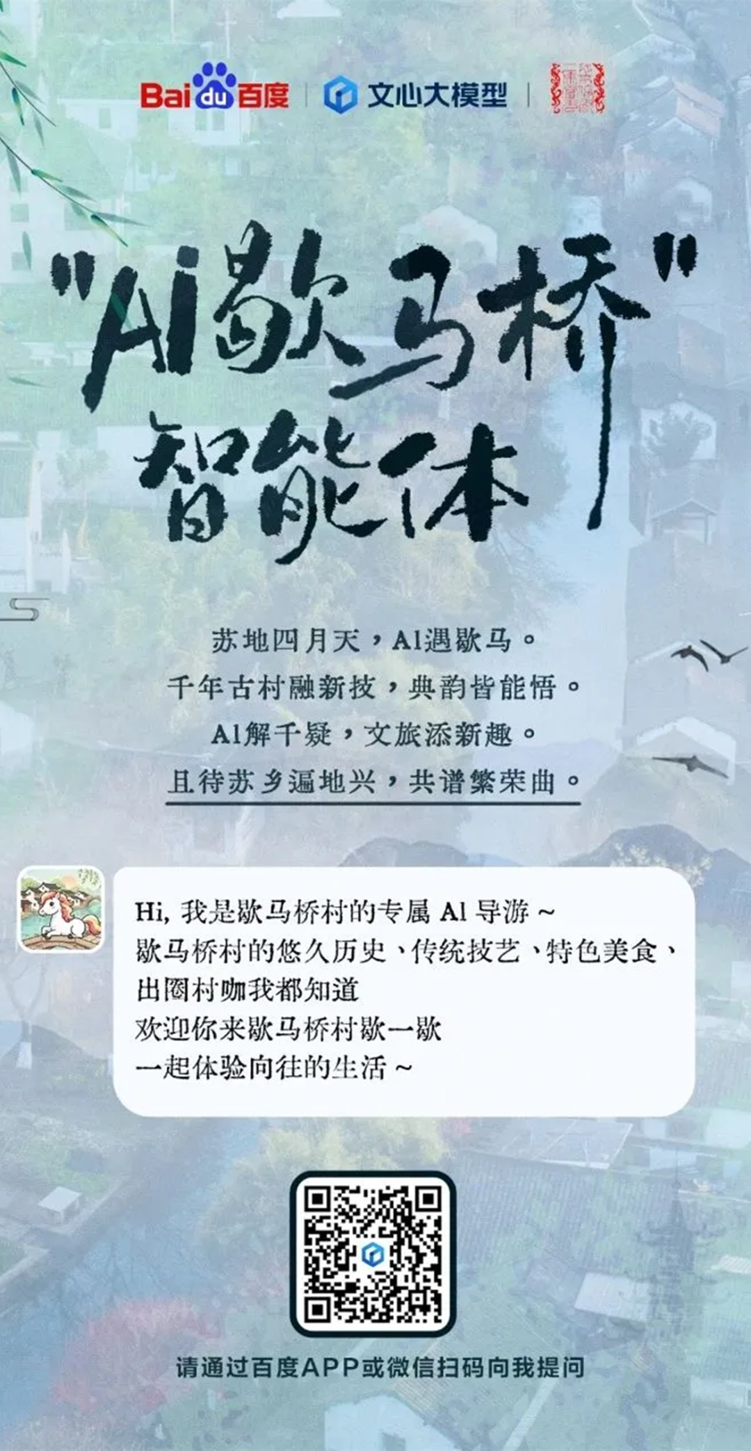 在农业前沿科技成果展示对接环节上,由苏州市农业农村局指导,百度文心大模型与千灯镇歇马桥村联合打造的乡村智能体——“Ai歇马桥”正式亮相。通过构建“AI+乡村文旅”新场景,有力推动了人工智能技术与乡村文旅产业的深度融合,更好赋能歇马桥乡村文化传承和文旅产业发展。
