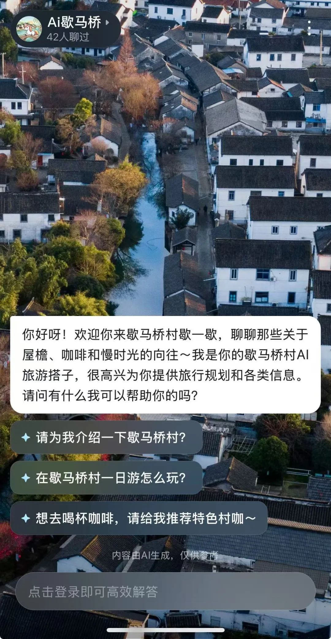 “Ai歇马桥”智能体深度学习了歇马桥千年村史以及覆盖吃住行等文旅领域的信息,构建起涵盖村落历史、文化典故、非遗技艺、特色美食、住宿购物、村咖文化等多元维度的知识体系,不仅可以随时随地为游客解答关于歇马桥村的各种问题,提供更准确、更便捷、更智能的乡村旅游服务。同时,通过打造数字化、智能化工作场景,提升工作效率。