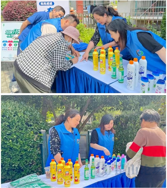 在瓶瓶罐罐可回收物兑换点,垃圾分类督导员积极向小区业主宣导垃圾分类知识,并在回收区域开展可回收物回收活动。