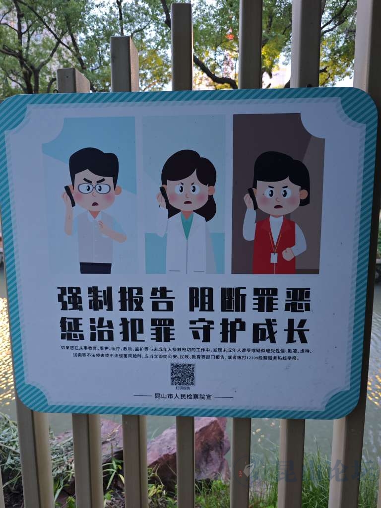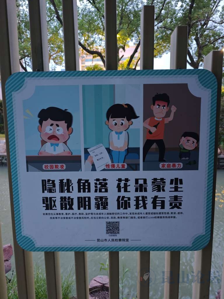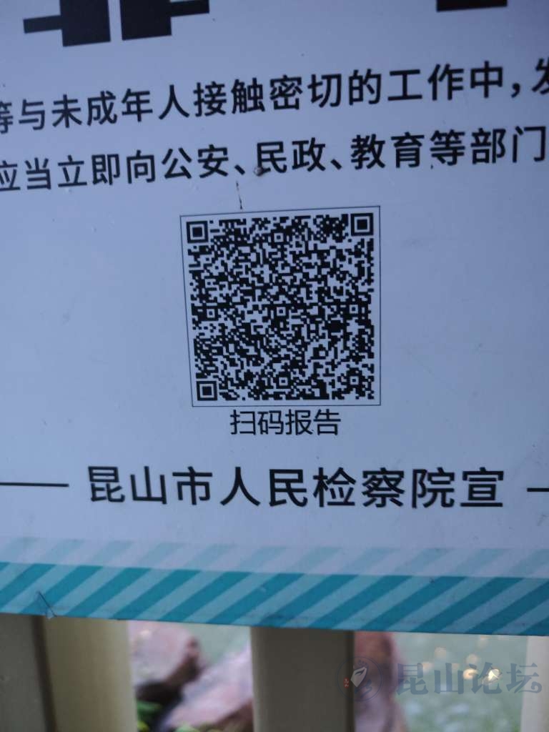 儿童城市公园,里面有两块昆山市人民检察院设立的广告牌,上面是如果发现未成年人被不法侵害时,可以扫码报告,但是这二维码不能使用。