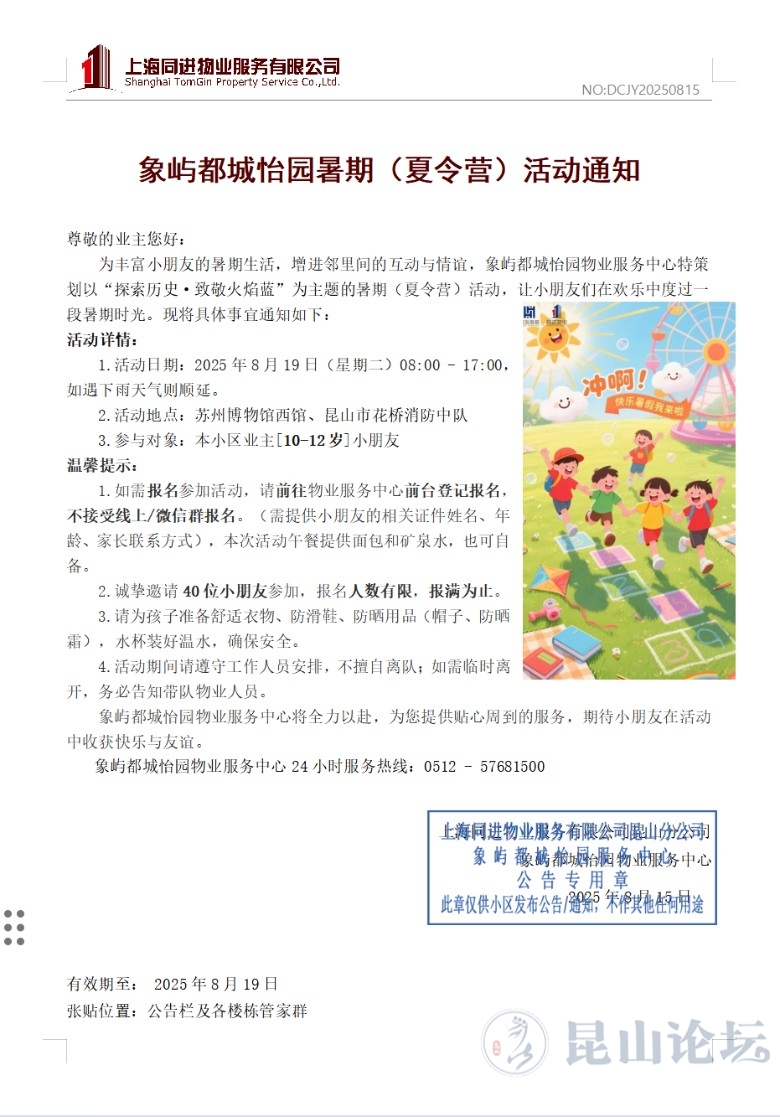 为了让小朋友们度过一个充实而有意义的暑假,2025年8月19日,上海同进物业象屿都城怡园服务中心精心策划了以“探索历史·致敬火焰蓝”为主题的暑期夏令营活动,为小区的小朋友们带来了一场兼具意义与趣味的实践之旅。 当天早上8点,孩子们便怀揣着期待,早早在小区西门排起了整齐的长队,等候乘坐大巴车。8点40分,大巴缓缓驶入昆山市花桥政府专职消防救援队。在消防员的引导下,小朋友们有序地开启了参观与演练环节。消防员们不仅生动细致地讲解了消防安全知识,带孩子们近距离参观了各类消防设施设备,还现场演示了实用的消防演练。这次沉浸式的消防体验,让孩子们对消防知识有了更直观的认识,也加深了对消防隐患的警惕性。 中午11点左右,大巴车向着苏州博物馆西馆出发。苏州博物馆西馆是一座集历史、艺术与科技于一体的现代化博物馆,承载着丰富的吴地文化记忆。在这里,孩子们在讲解员的带领下,走进了吴地历史展厅,从远古的良渚文化玉器,到唐宋的青瓷雅韵,再到明清的市井繁华,仿佛穿越时空,触摸着苏州这片土地的历史脉络。同时,馆内的“书画艺术厅”展示了历代文人墨客的佳作,让孩子们感受到传统笔墨的魅力;“工艺厅”里精美的苏绣、玉雕、木雕等手工艺品,则让大家惊叹于吴地工匠的精湛技艺。通过这次参观,孩子们不仅拓宽了视野更在潜移默化中加深了对历史文化的了解与热爱。 整个夏令营活动充实而有意义,既让孩子们学到了实用的安全知识,也在历史文化的熏陶中收获了成长。通过参观消防中队,孩子们学习到了实用的消防安全知识,增强了安全意识,同时也对消防员这份职业有了更深的敬意;参观苏州博物馆西馆,则让孩子们领略了苏州悠久的历史和灿烂的文化,激发了他们对家乡的热爱之情。象屿都城怡园物业服务中心将继续秉承服务业主的理念,举办更多丰富多彩的社区活动,为孩子们创造更多学习和成长的机会,让每一位业主都能感受到社区大家庭的温暖。期待下一次活动,我们再次相聚!上海同进物业服务有限公司昆山分公司 象屿都城怡园物业服务中心 2025年08月19日