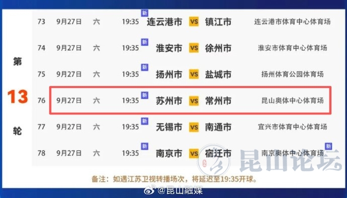 根据赛程安排,9月27日苏超第十三轮比赛,苏州队将主场迎战常州队,比赛地点为昆山奥体中心体育场。一起为苏州队加油!