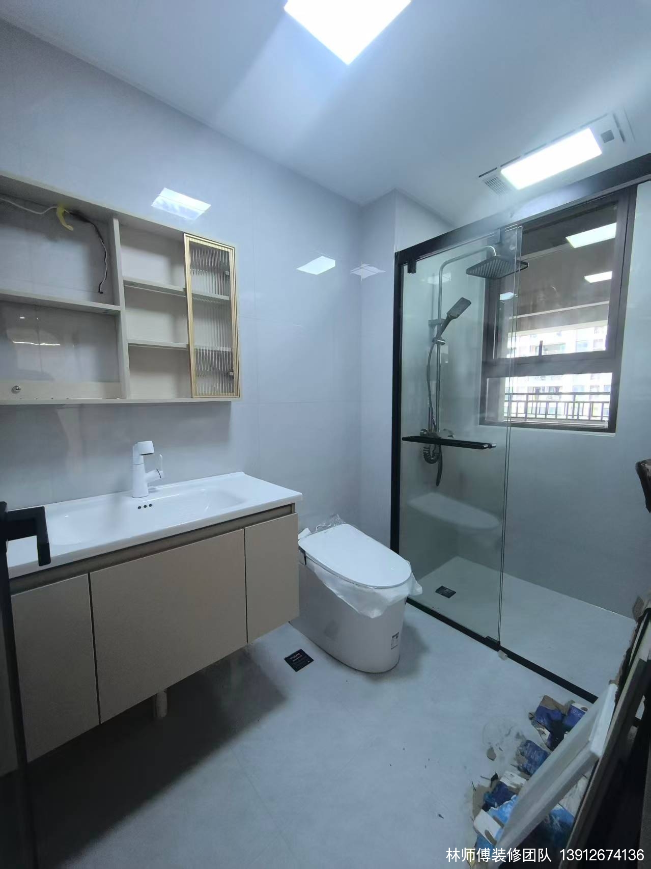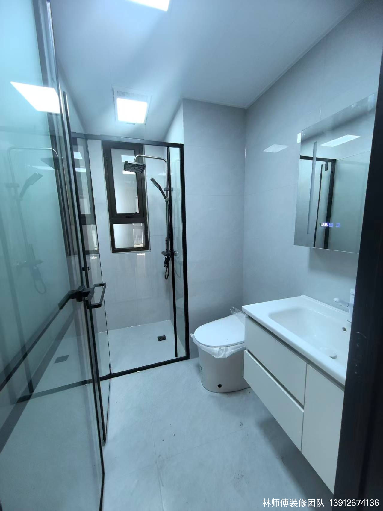 两个洗手间都做了干湿分离—— 用玻璃隔断把淋浴区和洗漱区隔开,洗澡后地面不积水,打扫更轻松。从台下盆、马桶到灯具、浴霸,甚至地面的防滑砖、吊顶的铝扣板,全包含在 9.5 万预算里,没有额外增项,性价比直接拉满。