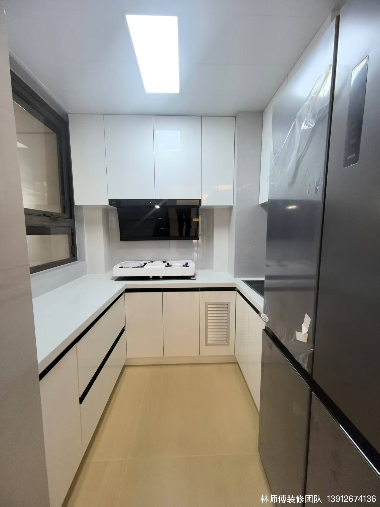 玄关的背面就是厨房,考虑到做饭时的操作动线,设计成了U 型布局—— 洗、切、炒三个区域依次排开,转身就能完成操作,即使两个人在厨房忙碌也不拥挤。为了让小厨房显大又干净,橱柜和台面全选了白色:石英石台面耐脏易清洁,溅上油污一擦就掉;地柜+吊柜,收纳满分,把米箱、油盐罐、锅碗瓢盆全藏进去,台面始终保持整洁。