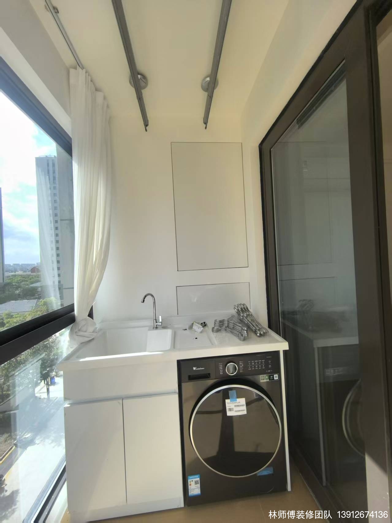 双阳台的设计太实用!客厅连接的是休闲阳台,和客厅打通后,装了一扇拱形门,搭配大大的落地窗,白天阳光洒进来,在阳台放一张小茶几、两把椅子,喝茶、看书、晒太阳,简直是 “治愈小角落”;次卧外的是生活阳台,把洗衣机放在柜子下面,整体统一。