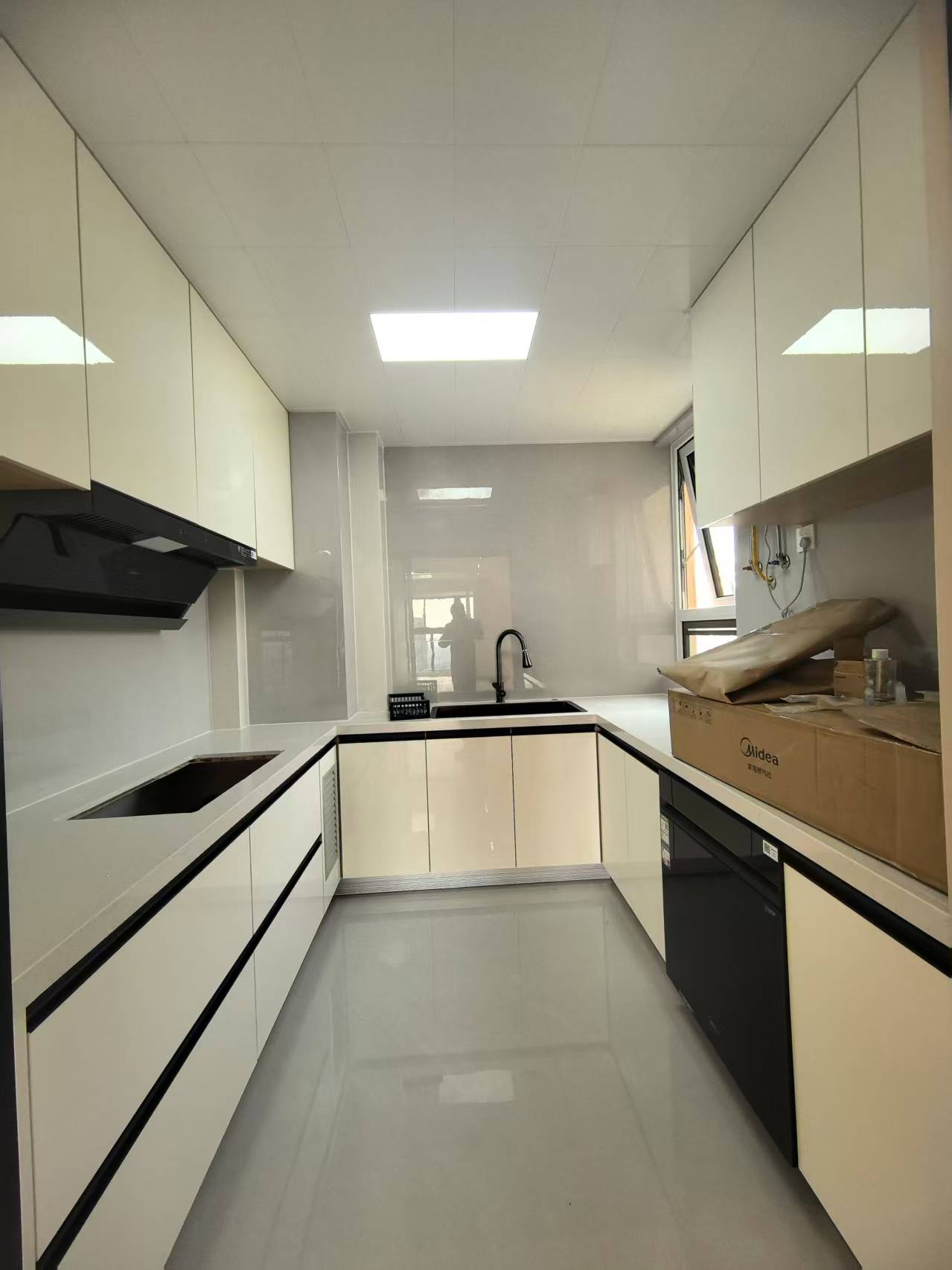 厨房是白色 U 型设计,上下吊柜裹满整面墙,地柜藏锅碗、吊柜收调料,台面只留常用小家电,清爽又能装;黑色五金线条点缀,简约里透着精致,做饭动线顺得 “行云流水”。