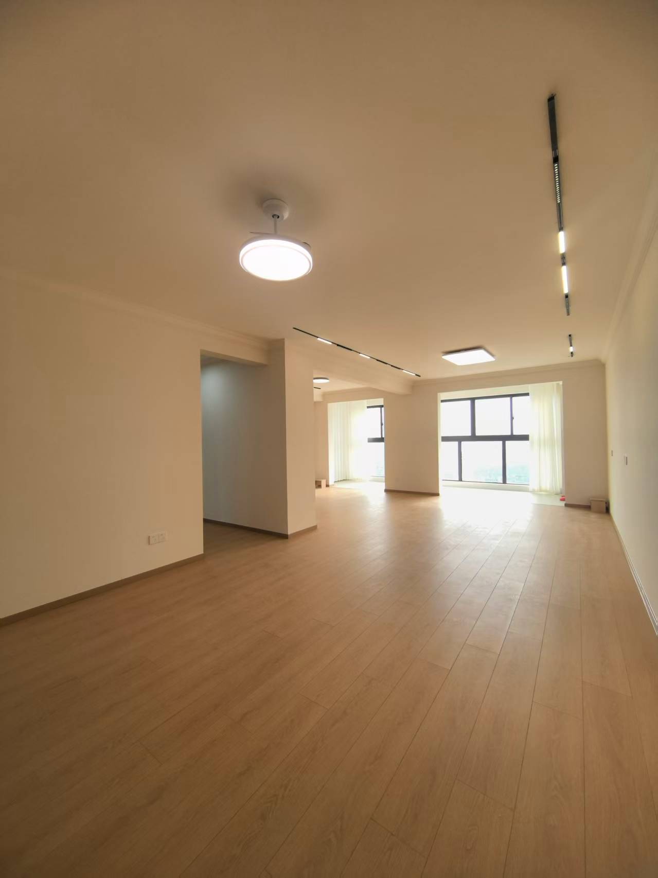 客餐厅在一个空间内,通铺暖调实木镀层地板,脚感温润不凉,餐厅紧挨着厨房门口,装了带风扇的吊灯 —— 夏天吃饭不用开空调,轻风吹着饭菜香,连聚餐都少了几分燥热。后期可以根据家里的布置购置自己喜欢的矮柜等,让家里更加温馨。
