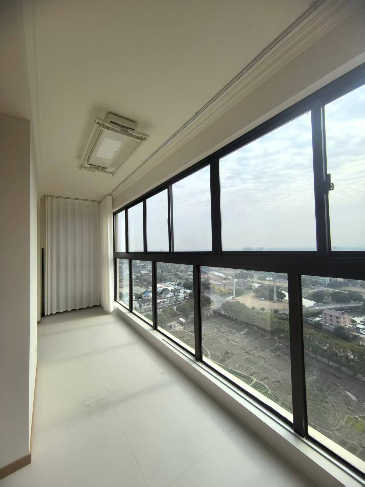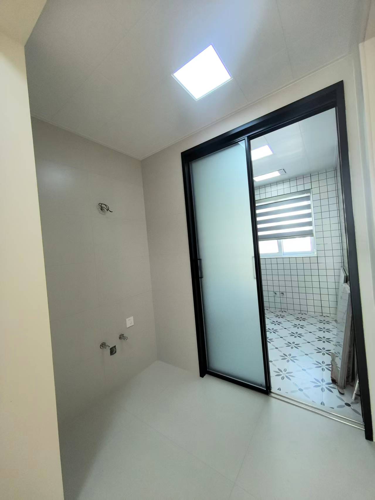 阳台是这套房的 “幸福彩蛋”,双阳台通铺 800×800 大地砖,视觉直接延伸到窗外,和客厅、横厅连成 “无界空间”。一边做洗烘机柜 + 收纳柜,囤清洁用品,承包生活琐碎;一边摆绿植,冬日阳光一洒,一半烟火一半诗意,幸福都变具象了。