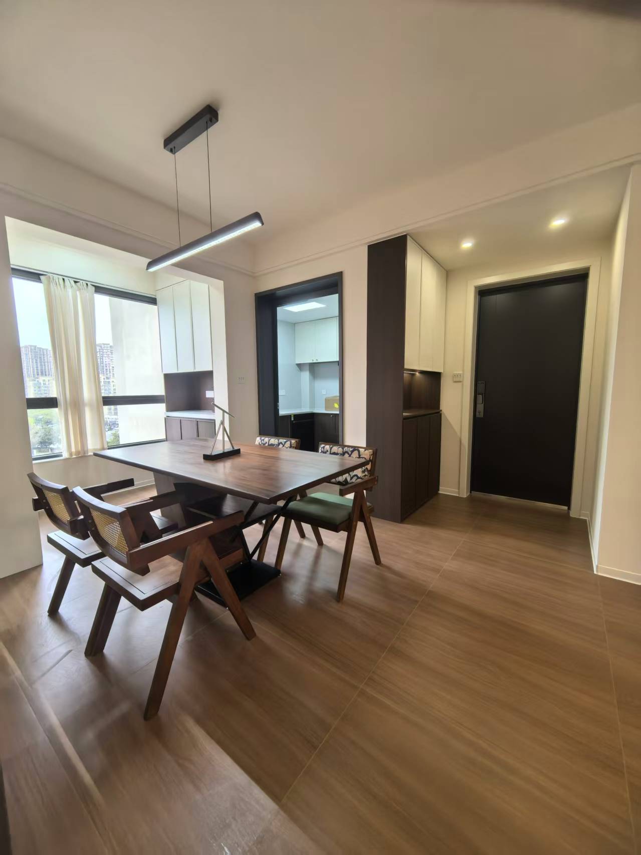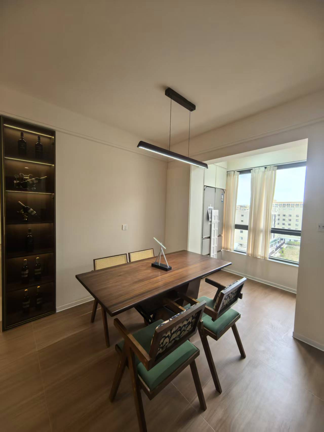 餐厅是 “复古氛围担当”,木质长方形餐桌选了胡桃木纹理,自带温润的复古质感,再搭配墨绿色软包椅,复古感瞬间拉满。顶上是一盏黑色线性吊灯,极简线条中和了复古家具的厚重感,开灯后光线均匀不刺眼,吃饭时的氛围刚好。旁边的深色酒柜藏在墙里:玻璃层板 + 内嵌小射灯,摆上红酒、高脚杯,灯光一打就是家里的 “颜值展示区”。