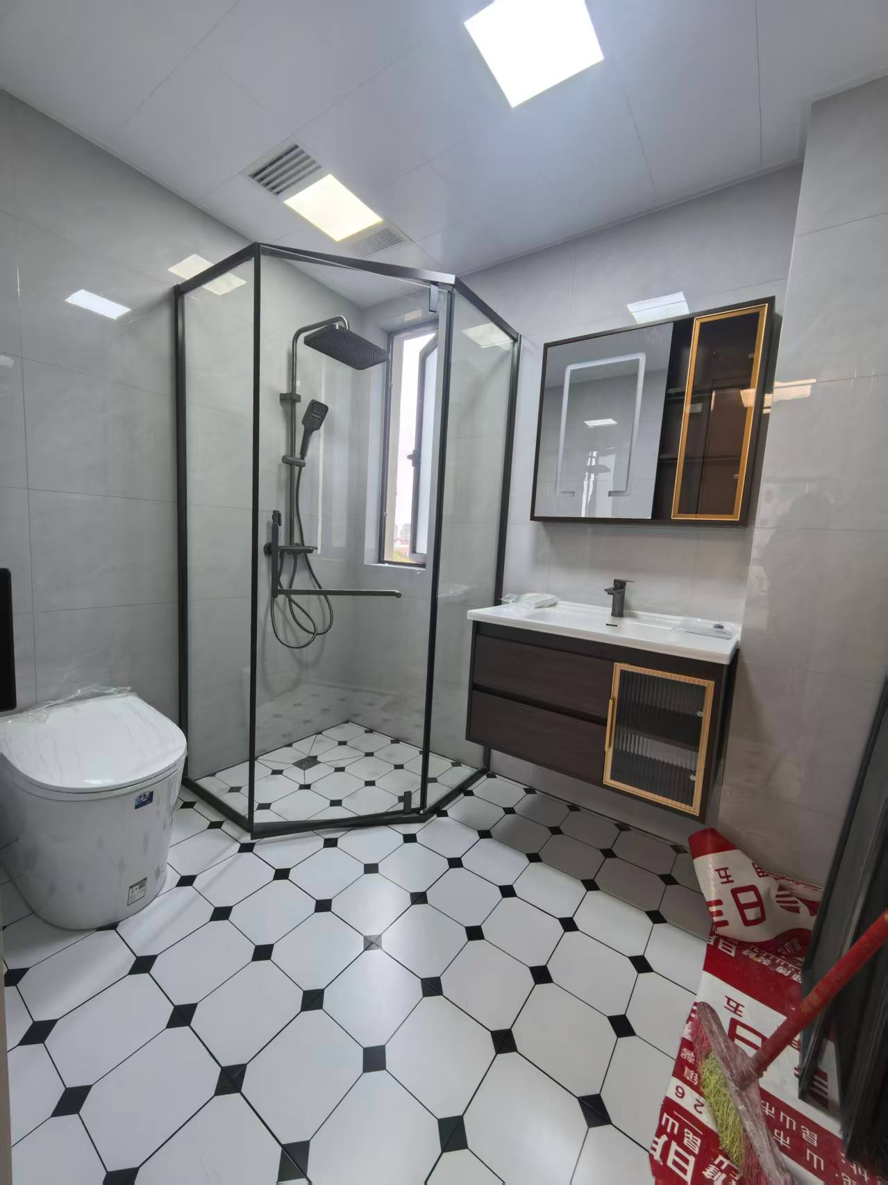 主卫选了钻石型淋浴房,比普通方形节省至少 0.5㎡空间,玻璃门做了 “黑色极窄边框”,和棕白主调呼应,更显精致。洗漱区装了带储物的镜面柜,瓶瓶罐罐都藏进柜子里,台面只留常用的牙刷杯,永远整洁