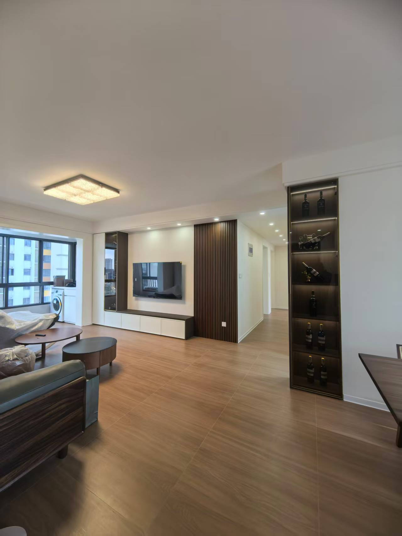 客厅是 “现代与复古的融合场”,一眼就惊艳。L 型电视柜是 “收纳 + 展示双担当”,封闭柜藏起路由器、机顶盒、零食囤货,让台面永远整洁。背景墙的木栅栏装饰是 “氛围杀手锏”,竖条纹理自带延伸感,阳光透过窗户落在格栅上,光影交错间,复古的典雅感扑面而来。