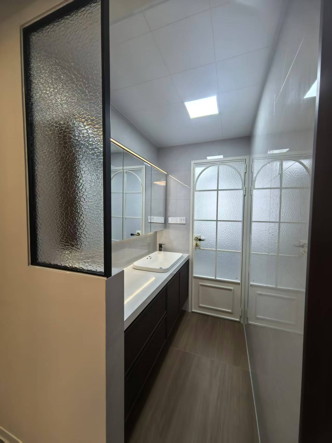 客卫三分离设计,洗手池外移到过道,早上洗漱、上厕所、洗澡可以同时进行,不用排队,半面长虹玻璃隔断是 “神来之笔”:既不会像实墙一样挡光,又能模糊空间边界,保证隐私的同时,让过道的光线能透进卫生间,复古通透感直接拉满。