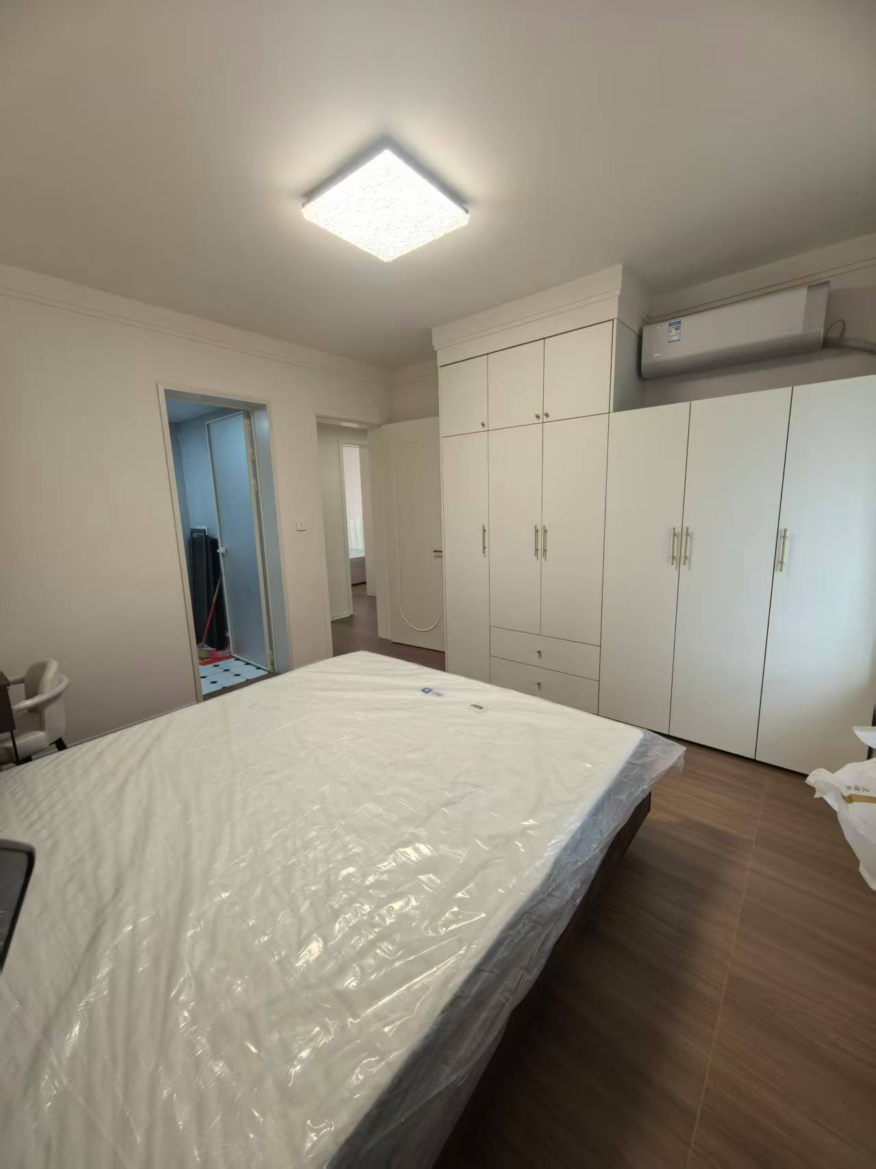 主卧整面墙做了白色到顶衣柜,柜门选了极简平板门 + 金色小把手,简约中藏着复古精致感;内部做了 “挂衣区 + 抽屉区 + 折叠区”,连衣裙、内衣、毛衣都能分类收纳。