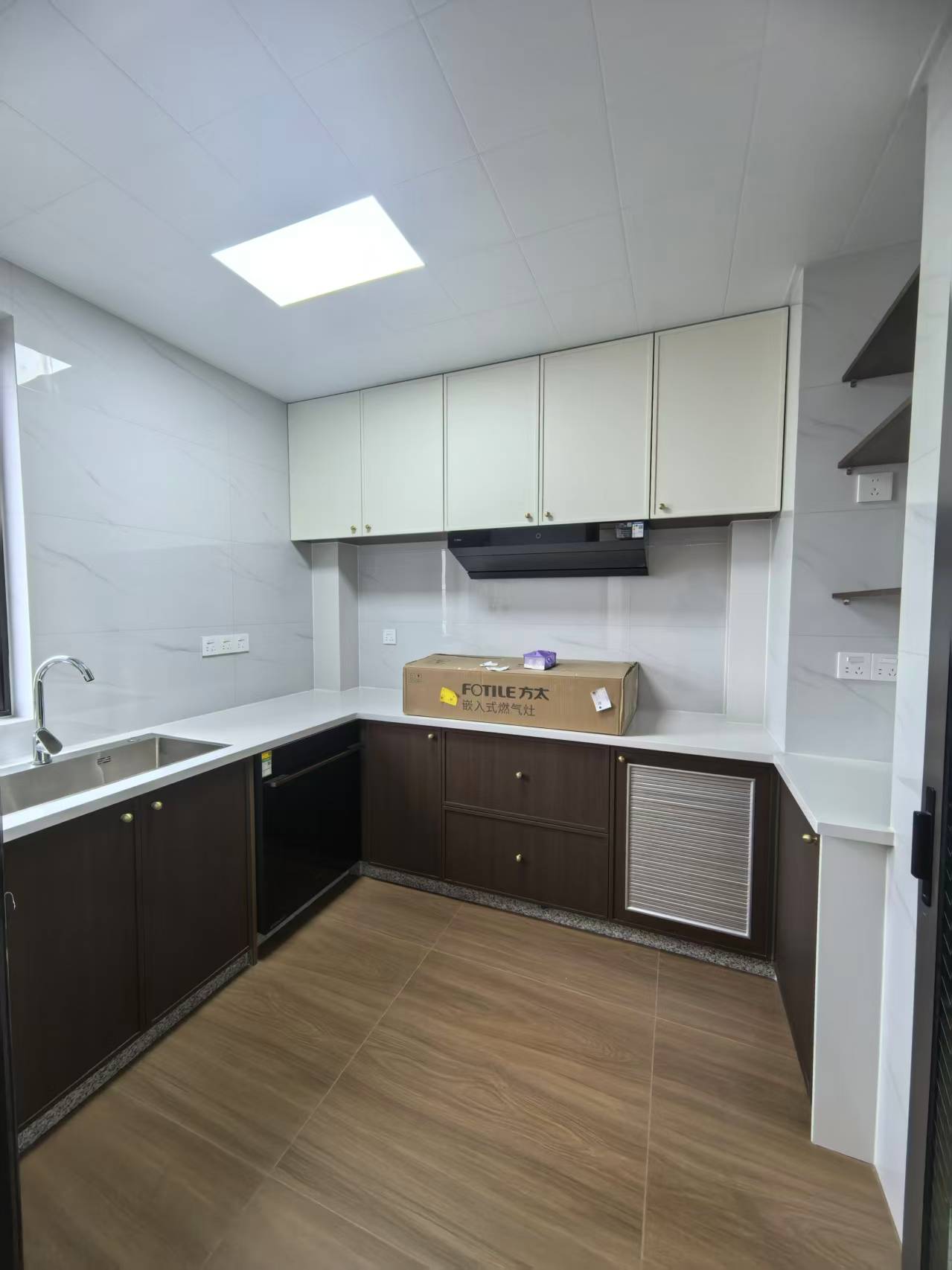 厨房延续 “棕白主调”,U 型布局把空间用到极致。台面选了白色石英石,耐脏好打理;下柜是深棕色,和入户柜形成统一感;上柜是米白色,避免厨房过于暗沉。操作区做了 “洗 - 切 - 炒” 的动线,拿取食材、处理菜品、下锅烹饪一气呵成,墙面上还加了隔板,调料瓶、油壶、常用锅铲都摆在这里,不用弯腰开柜门,炒菜时伸手就能拿到。