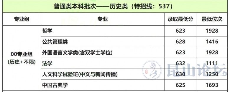 历史类最高632分(法学),最低623分(哲学、外国语言文学类【含双学士学位】)。