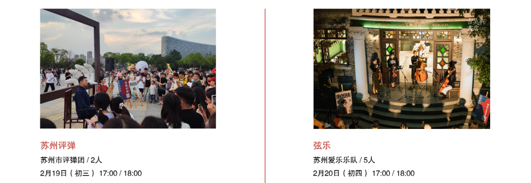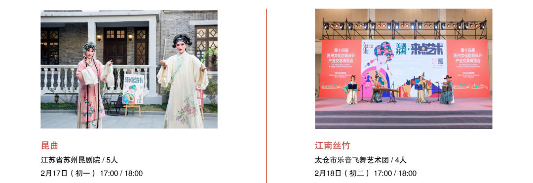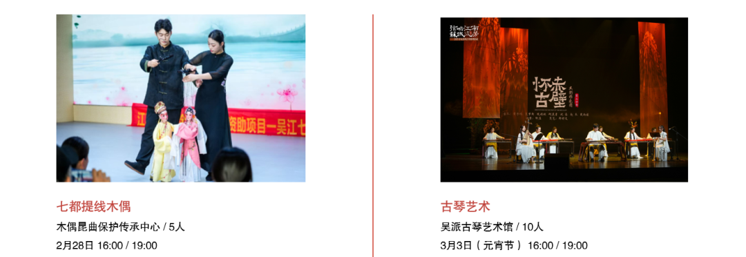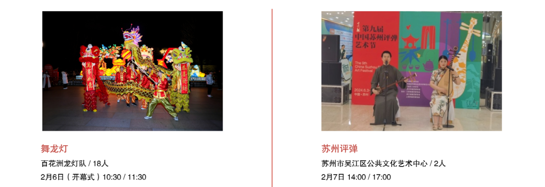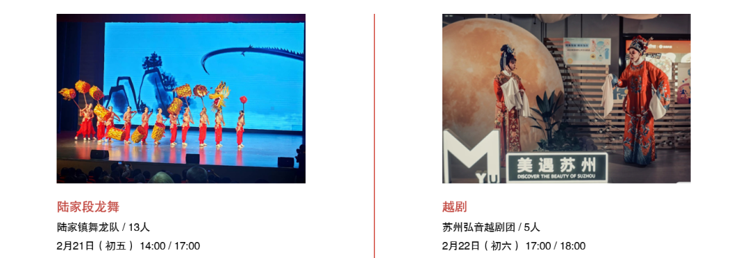 从春节前到元宵佳节,精彩轮番上演:舞龙灯热闹开年,苏州评弹轻拨心弦,江南丝竹婉转悠扬,昆曲水磨腔韵致动人,更有陆家段龙舞、七都提线木偶、古琴艺术等非遗表演,更有“来点艺术”加持,带你过足戏瘾!