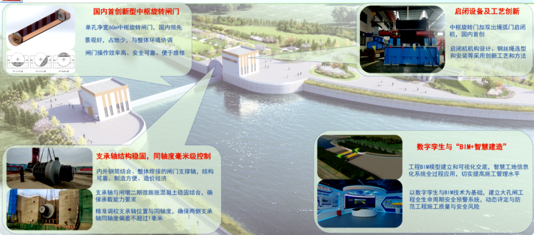 国内首次应用单孔净宽60m中枢旋转门,节省占地,提升泄洪与通航效率,融合城市景观。