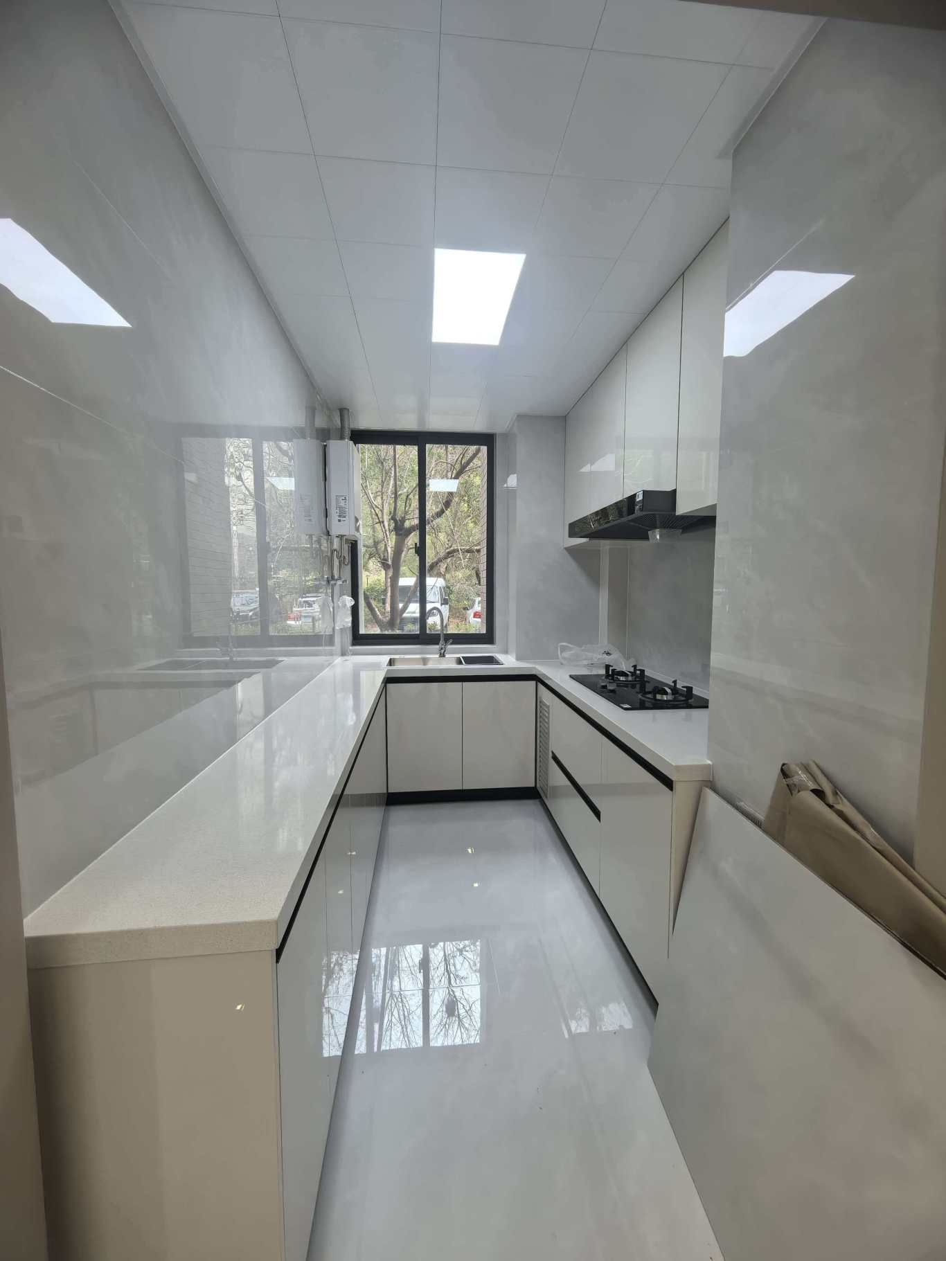 针对长条形户型,我们打造了黄金 U 型厨房,让洗、切、炒动线丝滑,转身即达,减少来回奔波,做饭效率直接翻倍。全亮面瓷砖 + 奶白色橱柜,搭配整面窗户的自然光,彻底告别传统厨房的油烟压抑感,让空间通透又干净。