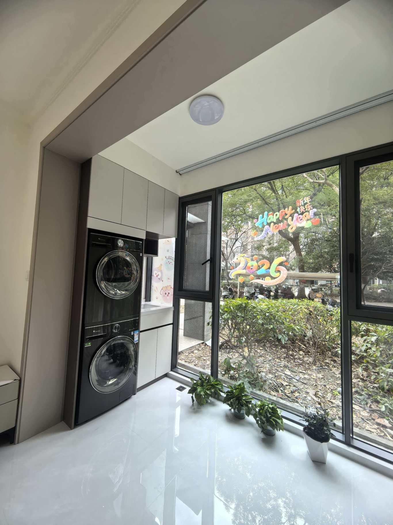 阳台落地窗 + 地砖通铺,采光和视野都非常好,洗烘一体机内嵌定制柜,洗衣、晾晒、收纳一体化,既私密又方便,不占用公共空间。