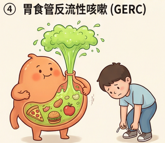 胃酸或胃内容物反流至食管、咽喉,甚至刺激气道,引发咳嗽,白天发作较多,吃饱饭、躺下或弯腰时症状加重,部分人还伴有反酸、烧心、胸骨后不适。