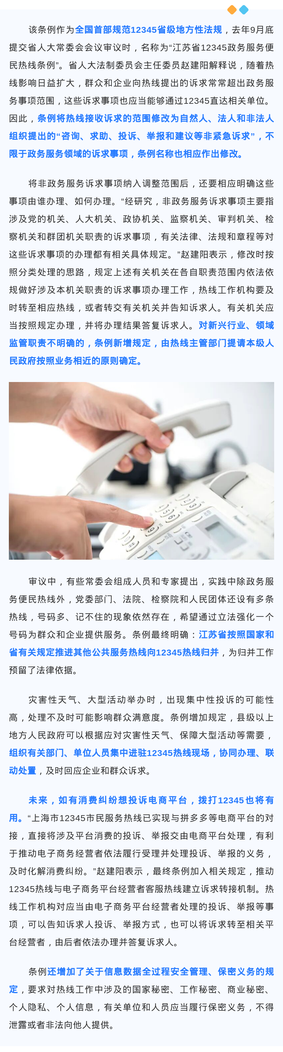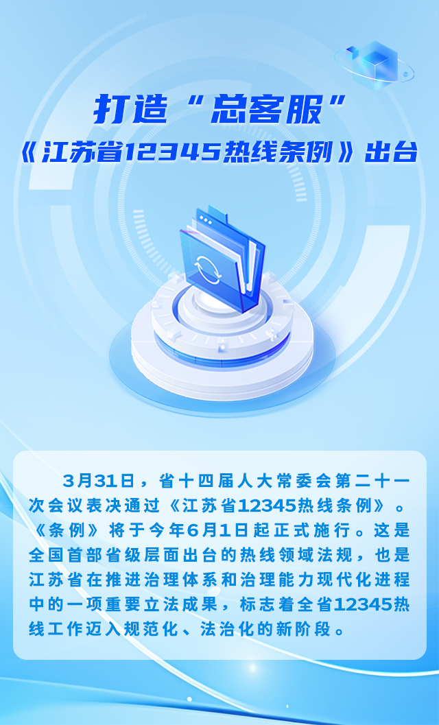 3月31日,省十四届人大常委会第二十一次会议表决通过了《江苏省12345热线条例》。和初审时相比,最终的条例着重围绕“打热线更方便”进行大量修改,法规名称也作出改变,以打造江苏省全面接诉的“总客服”。