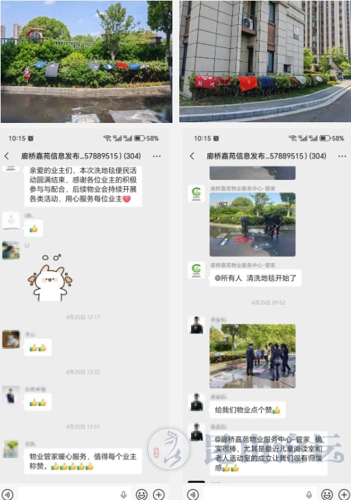 为积极响应4月8日昆山市物业协会“净美家园迎盛会”主题实践活动工作部署,晨安物业廊桥嘉苑物业服务中心于2026年4月25日,全面开展节前园区品质提升专项行动,以细致入微的服务、扎实高效的工作,为全体业主打造整洁、温馨、安全的居住氛围,以全新面貌迎接五一劳动节的到来。 持续开展地毯清洗便民服务,用心解决业主日常清洁难题,把便民服务做细做实,让温暖常伴身边。早上9点刚过,廊桥嘉苑小区就渐渐热闹了起来。物业工作人员早早布置好了活动区域,等待业主家人们的到来。 看,一条条等待“沐浴”的地毯排起了队,业主们也陆续带着地毯、地垫来到活动现场。随后物业人员便开始忙了起来,高压水枪冲洗,喷洒洗衣粉,再用刷子刷,简单的道具完成了不容易的清洁工作。弯腰、起身、冲洗、晾晒......物业工作人员认真清洗这每一张地垫,一快快沾满灰尘与污渍的地垫渐渐褪去尘埃,重新变得洁净如新。 实实在在的的便民举措,贴心又接地气,让业主在家门口就能享受暖心服务,收获一众好评。园区环境精修细护,全域焕新氛围感拉满。①花卉种植,绿植补种,草皮补种 为营造温馨雅致、整洁清爽的社区氛围,物业同步开展全方位环境美化工作,精心栽种各色鲜花,对园区绿植进行全面补种;②园区修剪及杂草落叶清理 对整个园区绿植开展精细化修剪,及时清理园区杂草、落叶及各类垃圾,不留卫生死角。③园区绿化虫害消杀 为保障小区绿植健康生长,全面开启了春季“护绿除虫”行动,防害护绿,科学施策,遵循季节病虫滋生规律,融合绿色防控与专业药剂消杀,精准阻断病虫隐患,全方位守护绿植茁壮生长。④公区硬化 提升公共区域整洁度,物业对垃圾房旁闲置地块进行了整治提升,现已完成地坪硬化施工,区域面貌焕然一新,为业主营造更加整洁有序的居住环境。 汛期将至,物业服务中心未雨绸缪,组织专业人员对小区所有下水井进行全面清掏作业,彻底清理井内淤泥、杂物,保障汛期排水系统畅通无阻,有效防范雨天积水问题,全力守护业主出行安全,筑牢社区防汛安全屏障。 物业工作人员对小区内所有指示牌、路灯杆进行全面保养与换新,擦拭除尘、修缮加固、更新焕色,让各类公共标识清晰醒目、路灯设施完好明亮,既保障了业主日常出行便捷,也让社区公共区域面貌焕然一新,进一步提升社区整体颜值。 此次节前专项提升行动,涵盖便民服务、绿化养护、环境整治、防汛保障、设施养护等多个维度,是廊桥嘉苑物业服务中心将市指导意见落到实处的具体体现,也是物业服务精细化、人性化的生动实践。每一次修剪、每一次清扫、每一项养护,都只为让业主生活更舒心、居住更安心、出行更放心。 未来,廊桥嘉苑物业服务中心将持续秉持匠心、坚守初心,不断优化服务细节、提升服务品质,以更用心的服务、更务实的行动,全力打造温馨和谐、宜居美好的社区家园,与业委会及全体业主携手共度幸福生活!